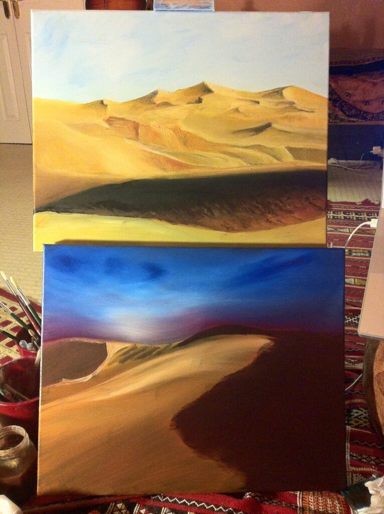 I had started painting this while allowing the second stage of ‘Dunes’ to harden. This is the thing with oil painting, you need to be patient with it. Especially if you’ve got ideas bursting out of you but you got to wait for the previous layer to harden. You gotta just let it keep burning inside of you as you stare at the previous layer. Or you could just paint the idea down onto a canvas pad as a practice paint.