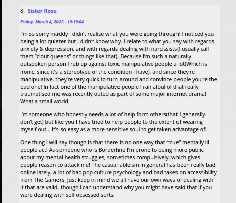 Yeah behind all the giggling and laughter you see on my channel and the photos I post of my adorable little d!ckhead cat, whom I love to pieces. There is a very pensive soul who keeps quiet about her struggles. True mental health sufferers do Not constantly make a public show about their suffering and ‘mental health’ on social media or otherwise… Ever! I think those who use mental health to attention seek are disgusting frankly. It takes away from those who are truly suffering from it.